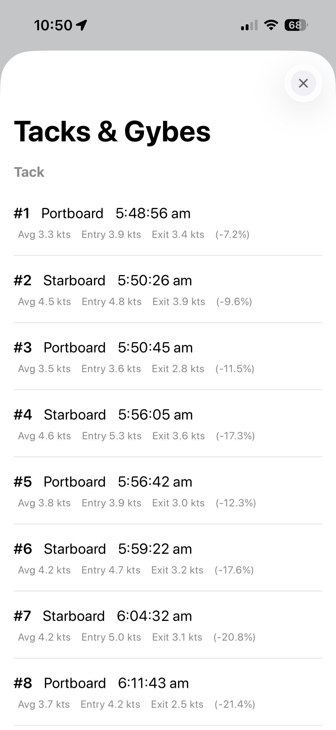 Waterspeed automatically tracks tacks and gybes using GPS data.